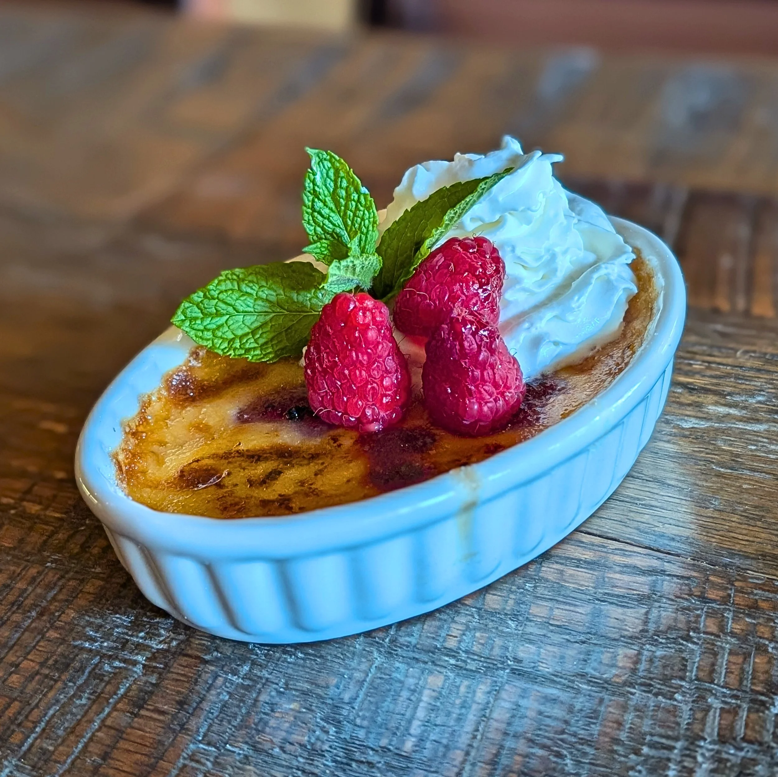 Raspberry Liqueur Custard / Brulee Sugar Served with Whipped Cream & Fresh Raspberry